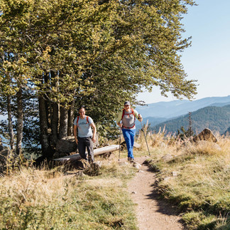 Am Samstag, den 21.09.2024 trafen sich die Guides Christoph, Felix und Verena mit den 16 Teilnehmer*innen am Bahnhof Münstertal. Wir freuten uns sehr, dass wir einige bekannte Gesichter sahen, die schon bei der Tour 2023 dabei waren. Vom Bahnhof aus fuhren wir mit dem Sutter Bus bis nach Kandern. Auf der Fahrt konnten alle noch ein erstes kleines Frühstück in Form eine frischgebackenen Brezel der Bäckerei Ebner zu sich nehmen. Um 06:15 Uhr liefen wir dann in Kandern los in Richtung Sausenburg. Zunächst noch im Dunkeln mit Stirnlampen, aber da uns schönes Wetter erwartete, konnten wir diese schon bald wegpacken und im ersten Tageslicht weiterlaufen. Nach dem Ausblick vom Turm der Sausenburg, auf dem wir auch einen kleinen Blick auf die Alpen erhaschen konnten, machten wir uns an den Anstieg zum Hochblauen (1165 m). Dort wartete die erste Verpflegungsstation, wo unsere Helferinnen Linda, Sonja und Verena ein tolles Frühstück für uns bereit hielten. Hier konnten wir den weiten Rundumblick über Schwarzwald, Feldberg, Rheinebene sowie ins Elsass und die Schweiz genießen. Anschließend ging es in sanft an- und absteigenden Wegen um den Stockberg herum in Richtung Weiherfelsen. Allerdings bogen wir vorher ab und erklommen noch den höchsten Punkt unserer diesjährigen Wanderung. Für viele eher unbekannt, aber dafür umso schöner sind die Aussichten vom Köhlgarten und Köhlgarten Ostgipfel (1224 m).
